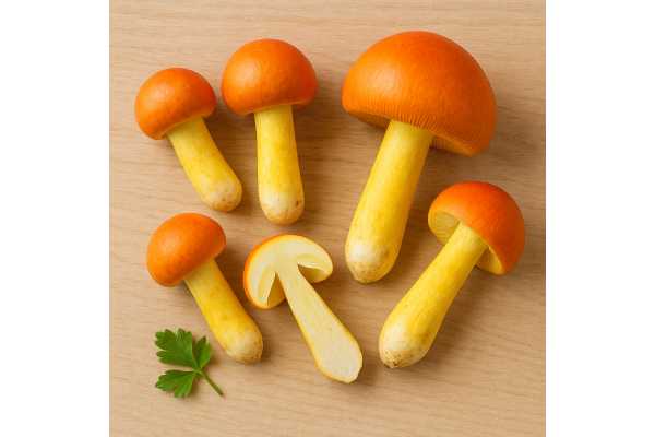 Flavor and texture: raw slices are tender with a mild sweetness and a faint nutty, egg-yolk note; brief heating intensifies aroma and brings out a buttery quality. Unlike many cultivated mushrooms, A. caesarea remains delicate and thin-fleshed, making it ideal for quick sautés, warm salads, and finishing dishes.