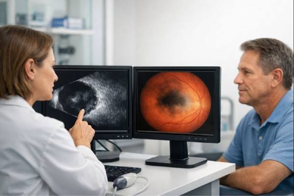 - B-Scan Ultrasonography: B-scan ultrasonography is a non-invasive imaging technique that employs sound waves to generate cross-sectional images of the eye. This method is especially useful when the vitreous hemorrhage is so dense that it prevents direct visualization of the retina. B-scans can detect retinal detachments, vitreous opacities, and other structural abnormalities in the eye. When blood or other opacities obscure the view through the pupil, it is a critical tool for assessing the posterior segment.