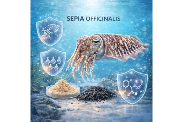 Sepia officinalis is a marine cephalopod, a relative of squid and octopus. The medicinal starting material comes from its ink sac, a small organ that produces a concentrated suspension of dark melanin granules in a viscous fluid. Chemically, this ink contains mainly eumelanin (a black brown pigment), along with minerals such as magnesium, calcium, sodium, and trace elements. Laboratory work has shown that sepia melanin has notable redox (oxidation reduction) activity and can act as a powerful absorber of light and reactive species.